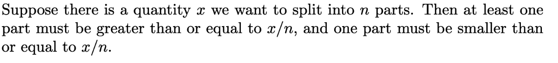 This is quite intuitive to see as well. If we distributed the pigeons evenly among the n holes, we would’ve put m pigeons in each hole equally. This would’ve housed mn pigeons. But since we have mn + 1 pigeons in total, we have 1 unhoused pigeon left, so at least one hole has m + 1 pigeons.